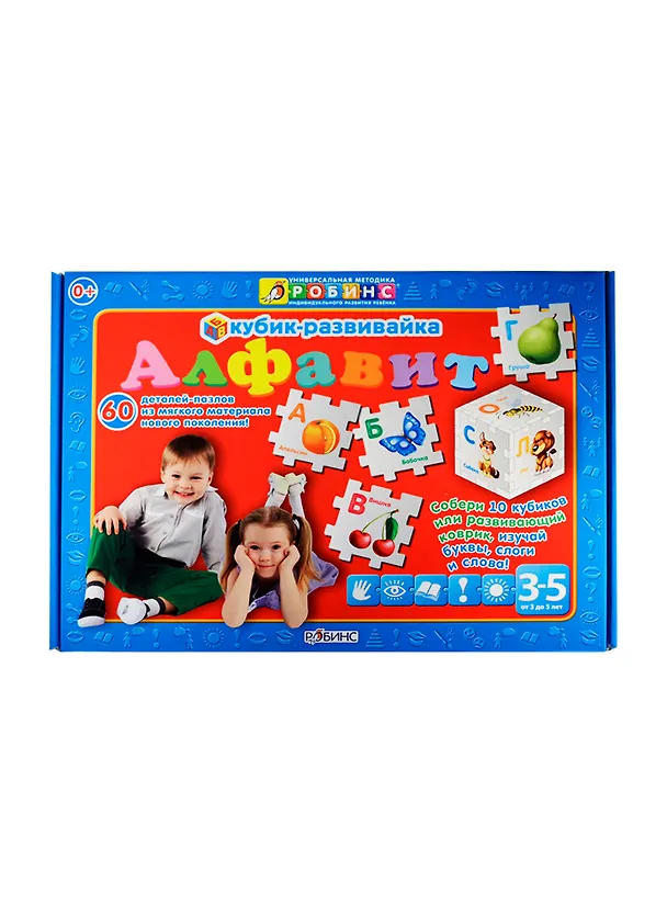 "Кубик-развивайка. Алфавит" состоит из 60 деталей-пазлов, которые можно соединить в 10 маленьких кубиков ( по 6 деталей в каждом), или 2 средних ( по 24 детали), или 1 большой (56 деталей), или развивающий коврик для ребенка (80х48).