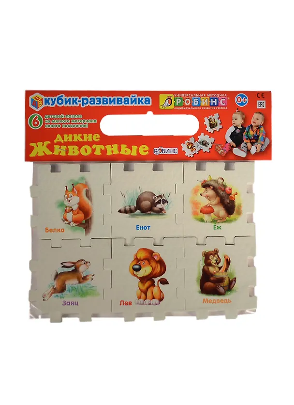 "Кубик-развивайка. Дикие животные" состоит из 60 деталей-пазлов, которые можно соединить в 10 маленьких кубиков ( по 6 деталей в каждом), или 2 средних ( по 24 детали), или 1 большой (56 деталей), или развивающий коврик для ребенка (80х48).