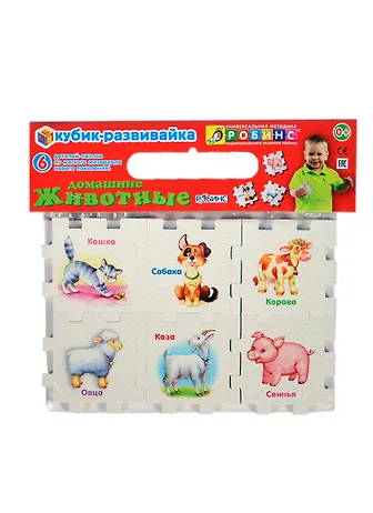 "Кубик-развивайка. Домашние животные" состоит из 60 деталей-пазлов, которые можно соединить в 10 маленьких кубиков ( по 6 деталей в каждом), или 2 средних ( по 24 детали), или 1 большой (56 деталей), или развивающий коврик для ребенка (80х48).