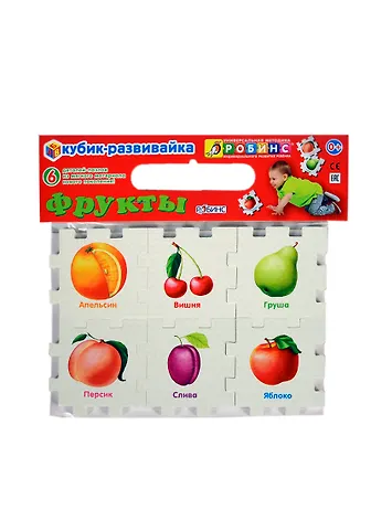 "Кубик-развивайка. Фрукты" состоит из 60 деталей-пазлов, которые можно соединить в 10 маленьких кубиков ( по 6 деталей в каждом), или 2 средних ( по 24 детали), или 1 большой (56 деталей), или развивающий коврик для ребенка (80х48).