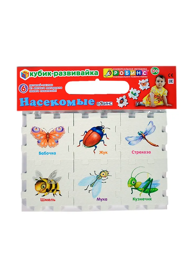 "Кубик-развивайка. Насекомые" состоит из 60 деталей-пазлов, которые можно соединить в 10 маленьких кубиков ( по 6 деталей в каждом), или 2 средних ( по 24 детали), или 1 большой (56 деталей), или развивающий коврик для ребенка (80х48).