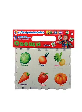 "Кубик-развивайка. Овощи" состоит из 60 деталей-пазлов, которые можно соединить в 10 маленьких кубиков ( по 6 деталей в каждом), или 2 средних ( по 24 детали), или 1 большой (56 деталей), или развивающий коврик для ребенка (80х48).