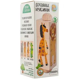 Деревянные кубики на оси «Зоопарк» для детей от 3-х лет изготавливаются из экологического материала – массива дерева. Изображения наносятся на кубик с применением технологии прямой печати, что обеспечивает износостойкость игрушки.