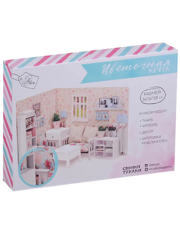 В набор входит: ткань, чипборд, декор, заготовки мебели и стен.