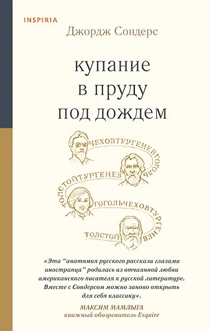 «Слава великого русского романа огромна; великому русскому рассказу повезло меньше. Американский писатель и преподаватель Джордж Сондерс пробует исправить эту несправедливость — и показывает, как по-новому взглянуть на короткие вещи Чехова, Тургенева, Толстого и Гоголя. В его остроумных и педантичных разборах различаешь жар фаната и холод исследователя — сочетание, которое присуще каждому хорошему читателю и сочинителю художественной прозы. Собственно, будущим авторам эта книга во многом и предназначена: «Купание в пруду под дождем» — одно из лучших пособий по литературному мастерству, книга с той же полки, что и набоковские «Лекции по литературе» или филологические эссе Кутзее». — Игорь Кириенков, книжный критик, автор "Полки"