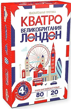 .Узнать названия британских городов и состав Великобритании, прочитать много интересного про Великобританию - про еду, архитектуру, музеи символы, футбольные клубы, мультфильмы, а еще про героев и сыщиков Лондона… собирать карточки, меняться, играть и выигрывать, думать, учить английский! Все это - в игре "Кватро". Это путеводитель, рассказ, фильм, а еще полезные интересные игры для всей семьи.
