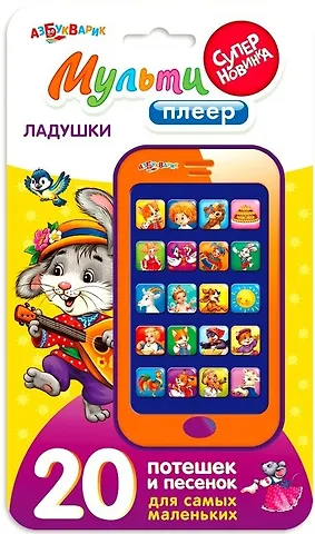 Новый модный плеер подарит отличное настроение! Нажимая на кнопочки, ребенок сможет послушать 20 популярных песенок из мультфильмов, а еще – подпеть Бременским музыкантам, Крошке Еноту, Паровозику из Ромашково и другим любимым героям. Компактный плеер поместится даже в кармане, а его стильный дизайн покорит всех.