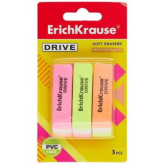 Самый лучший набор ластиков по названием " Drive" .Ластиков наборе всего лишь три штуки и все они разноцветные ,что мне в нем очень понравилось.Ластики и не маленького ,и не большого размера.Они очень ярких неоновых цветов.Розовый, оранжевый и зеленый цвета которые используются.Ластики удобные при использовании.Стирают отлично ,не оставляя и не размазывая грифель.Довольна покупкой.Советую покупать.