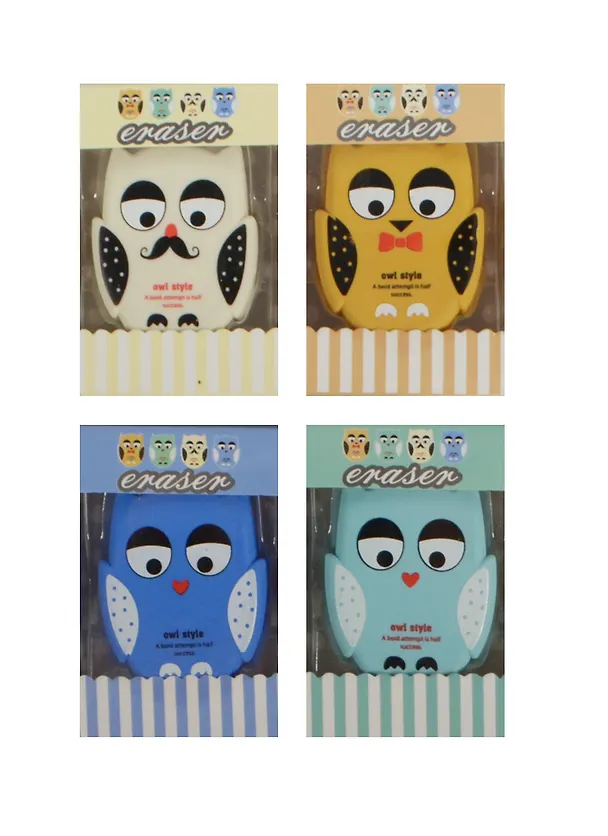 Ластик сова в индивидуальной упаковке.ОНа прозрачная.У ластика есть несколько выборов цвета.Выбрать нельзя, потому что это в ассортименте.Ластик и не большого, но и не маленького размера.Стирает великолепно, не оставляя какие-либо пятно за собой.Советую покупать.