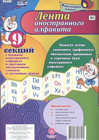 Лента иностранного алфавита. Раскладной плакат из 9 секций с буквами иностранного алфавита и цветовым обозначением гласных и согласных звуков