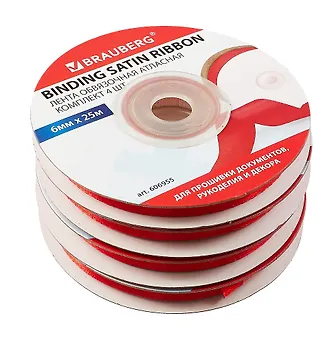 Обвязочная атласная лента BRAUBERG с ткаными кромками на обоих краях предназначена для декорирования подарков, прошивки документов, использования во флористике, рукоделии и декоре. Ширина ленты: 6 мм. Длина: 25 м. Количество в комплекте: 4 шт. Количество цветов: 1. Цвет: красный. Материал: полиэстер