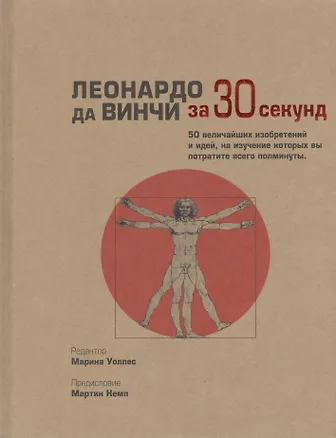 «Леонардо да Винчи за 30 секунд» - самый быстрый способ охватить и понять суть новаторских замыслов самого ярного творца эпохи Возрождения. Ведущие ученые представят вашему вниманию достоверные фанты, подтверждающие широту и мощь идей да Винчи. Каждая статья рассчитана на тридцатисекундное изучение и занимает не более двух страниц, н ноторым прилагаются чертежи и картины да Винчи.