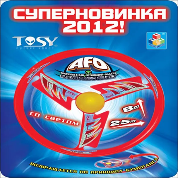 AFO Диск это не просто летающий диск, а это диск бумеранг который может вернуться обратно к игроку. Плюс супер яркие светодиоды будут автоматически включатся при полете, создавая яркие и красочные световые рисунки ночью! идеально подходит для ночной игры, 6 режимов запуска для использования внутри помещений и на открытом воздухе! Летает до8 мв высоту и на расстояние до25 метров! Соберите большую компанию друзей и устройте эффектный запуск в ночное небо эскадрильи AFO-дисков. Такое незабываемое зрелище запомнится надолго и вызовет бурю эмоций и у взрослых, и у детей.