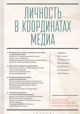 Коллективная монография продолжает книжную серию "Петербургская школа журналистики и массовых коммуникаций", подготовленную учеными Санкт-Петербургского государственного университета. Авторы представляют обобщение исследований, связанных с полисубъектностью современного медиатекста. С помощью различных методологических подходов: функционального, дискурсивного, жанрового, медиалингвистического — рассматриваются приемы и способы представления субъектов в разных типах средств массовой коммуникации.