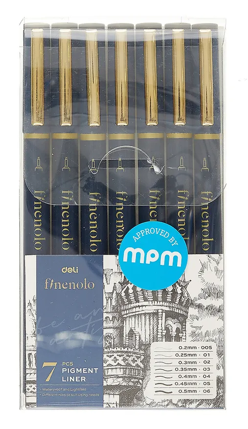 Очень нравятся линеры данной марки. В наборе целых 7 штук разной толщины наконечника - от самого тонкого до довольно жирных линий. Позволяет создать полноценный живой лайн так, что сложно будет отличить от рисунков пером. Линеры водостойкие, водой не размываются, спиртовыми маркерами тоже. Расход небольшой, я уже больше полугода рисую ими периодически, а они все не заканчиваются. Просто находка!