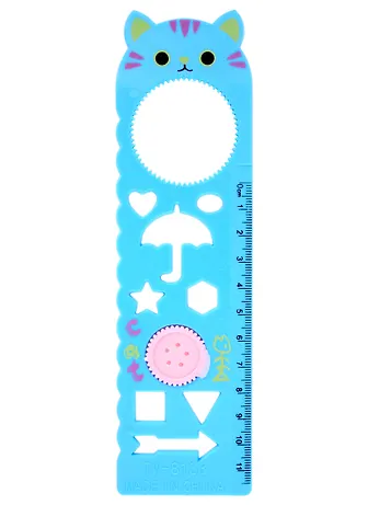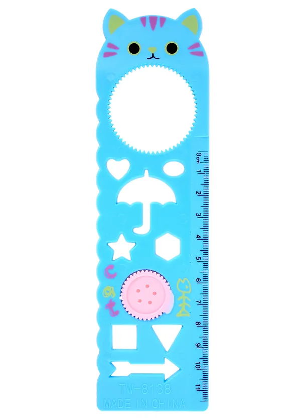 Когда-то в детстве такие трафареты были самой любимой игрушкой, а теперь я их покупаю своей племяннице. Спасибо, что дарите возможность вернуться в детство! Этот трафарет очень необычный, и по оформлению (в виде головы котёнка), и по своим прорезям (это не просто буквы и цифры, а фигурки для творчества). Ребёнку очень понравится рисовать с помощью этой линейки, а также сантиметровая разметка очень пригодится в школе. Два в одном - и трафарет, и линейка, круто!