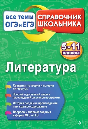 Особая структура справочника позволит в краткие сроки повторить или обобщить колоссальный объем школьной программы по литературе за 5-11 классы. Каждое произведение изучается по определенной схеме: биография автора и история создания → список действующих лиц и их характеристики → краткое содержание → жанровые особенности →экранизации → типовые вопросы в форме ОГЭ и ЕГЭ. Вся информация изложена доступно и понятно. Теперь подготовиться к урокам литературы и экзаменам будет легко даже в том случае, если произведение не было прочитано школьником.