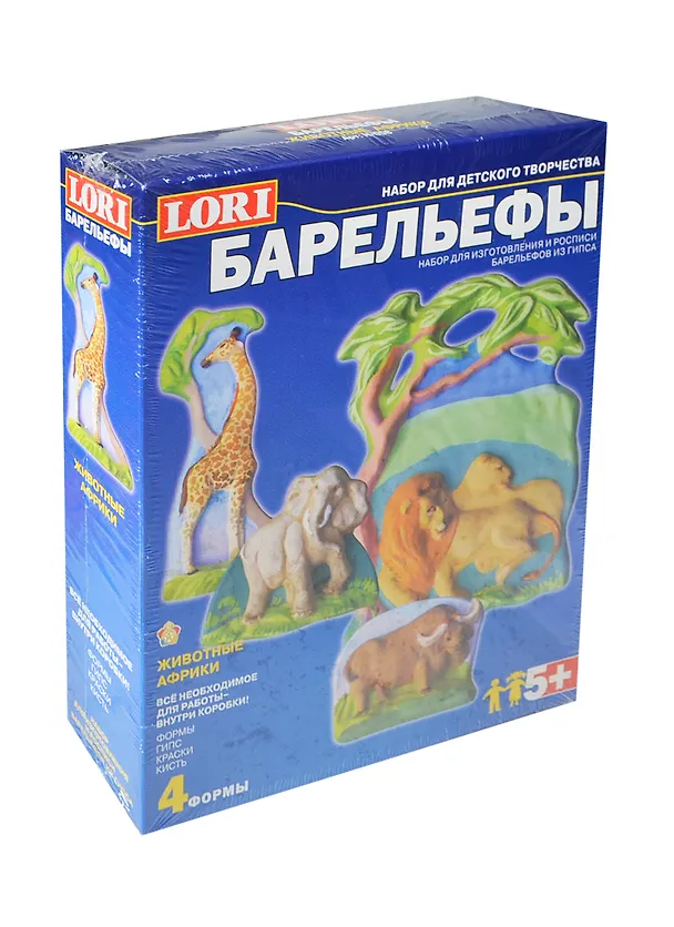 Набор для отливки барельефов из гипса ЖИВОТНЫЕ АФРИКИ разработан для детей от 5 лет. В наборе: 4 формы, гипс, акварельные краски, кисть, инструкция. С его помощью можно в домашних условиях изготовить фигурки африканских животных. Готовое произведение можно повесить на стену или поставить на видном месте. Оно не только станет отличным украшением Вашего дома, но и всегда будет радовать создавшего его мастера. При раскрашивании полученных фигурок ребенок получает возможность максимально проявить свои творческие способности и воображение. Работа с данным набором развивает фантазию и художественные способности, и весь процесс изготовления фигурок становится увлекательным и познавательным.