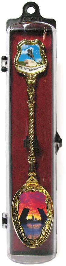Сувенирная металлическая ложка с видами СПб в коробке - отличный и недорогой подарок , который Вы можете привезти из Санкт-Петербурга.