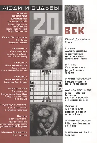 .Сборник ЛЮДИ И СУДЬБЫ. 20 ВЕК. КНИГА ОЧЕРКОВ, подготовленный группой "Современная художественная культура России", повествует о судьбах людей давно ушедших и наших современников, чьи имена составили и составляют славу прошлого века, чей благородный пример воспитал не одно поколение.