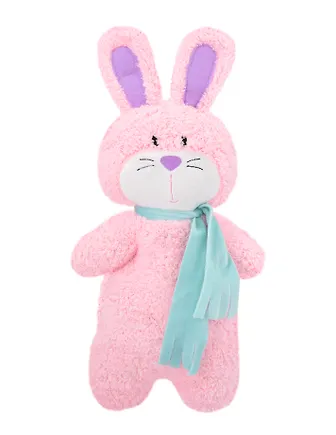Милый плюшевый зайка с шарфиком. Очень нравится, что он такого розового цвета, как жевачка. Да и голубой шарфик очень подходит по тону. Эта игрушка сочетает разные текстуры. Подходит для самых крошек, так как он весь мягкий, пушистый и в нем нет пластиковых деталей. Из-за формы с ним удобно и приятно спать, он отлично подходит как антистрес. Сшит прекрасно: все ровно и качественно.