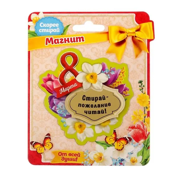 Магнит со скретч-слоем — необычный сувенир из нескольких элементов. Под стирающимся окошком расположен тёплый и нежный комплимент. Благодаря уникальному дизайну, разработанному специально для главного женского праздника, этот подарок долгое время будет радовать обладательницу.