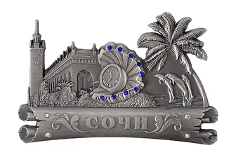 Магнит фигурный «Ж‑д. вокзал, Жемчужина, часы, Дельфины» (металл, Сочи), артикул 027‑1ATN‑135K02 — металлический сувенир оригинальной формы с композицией из знаковых объектов Сочи. В дизайне объединены железнодорожный вокзал, отель «Жемчужина», архитектурные часы и морские дельфины — ключевые символы города. Сочетает туристическую привлекательность и декоративную выразительность, подходит для оформления интерьера и в качестве памятного подарка.