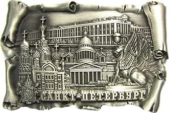 Сувенир АКМ Магнит свиток.мет.9,6*6,5 "Исаакий-Грифон-Спас-Эрмитаж" цв.ант.олово