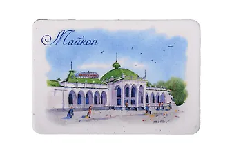 Магнит представляет собой сувенирное изделие из картона с изображением железнодорожного вокзала Майкопа — архитектурного памятника и значимого исторического объекта города.
