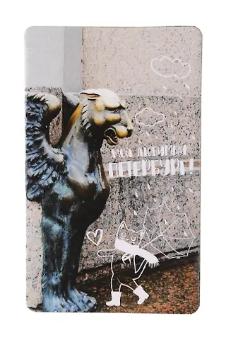 Фото нет, так что опишу кратко: магнит не горизонтальный, а вертикальный, в типично питерских ) серых тонах. В углу поверх фото с грифоном пририсован котик.