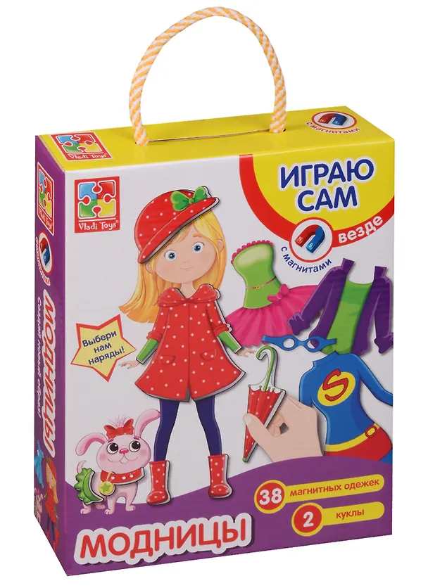 Особенности: в игре 2 персонажа и набор магнитных одежек на любой вкус, в модном журнале представлены основные модели и множество игр и головоломок. Комплектация: мягкие магнитные одежки - 34 шт, магнитные персонажи - 2 шт, шкаф для хранения одежек - 1 шт, модный журнал - 1 шт.