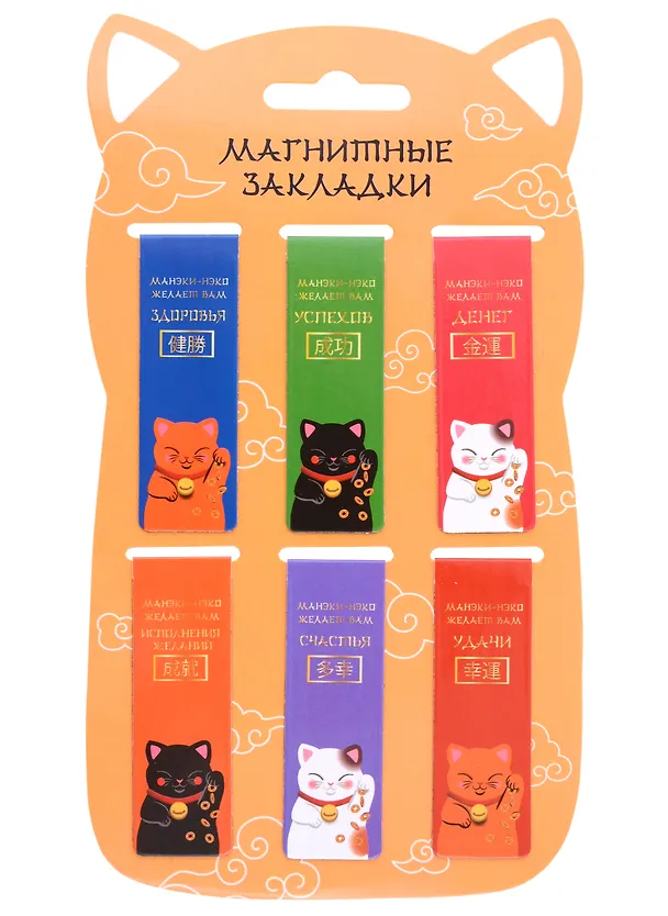 Искала дополнение к подарку девочке-подростку, увлеченной японской культурой, увидела эти милые закладки и сразу взяла. Надо сказать, что они довольно длинные, надежно захватывают страницу. Цвета фона и изображений яркие, не знаю соответствуют ли японские иероглифы русским пожеланиям, но задумка очень неплохая. Немного жаль, что цвета котиков повторяются, хотелось бы, что бы они различались, как фон.
