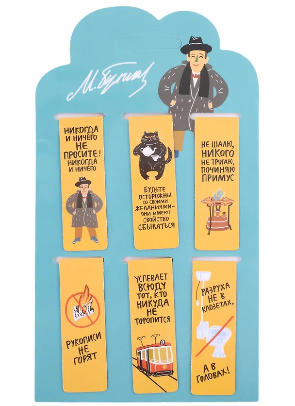 Прекрасные закладки с теми самыми, любимыми и известными всем, цитатами из "Мастера и Маргариты". Порадовала нетипичная рисовка персонажей и предметов - они понятны, но не такие, какими мы привыкли видеть их в иллюстрациях. А цвет - тот самый желтый, какой был у цветов Маргариты. Истинный любитель книги найдет много очевидных и не очень совпадений с романом. Ну и, конечно, при всем внешнем великолепии, закладки отлично держатся на страницах книги.