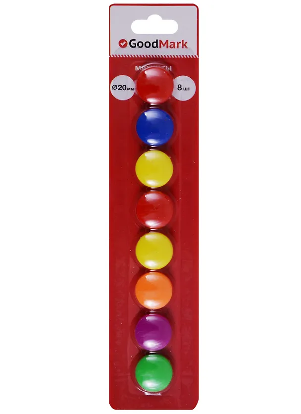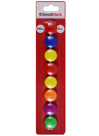 Магниты небольшого размера, яркие. Если крепить листы для заметок, хватит одного магнита, если не толстый картон небольшого формата (открытка), потребуется - 2 штуки. Я брала для прикрепления небольших листиков, так что они отлично справляются со своей задачей.