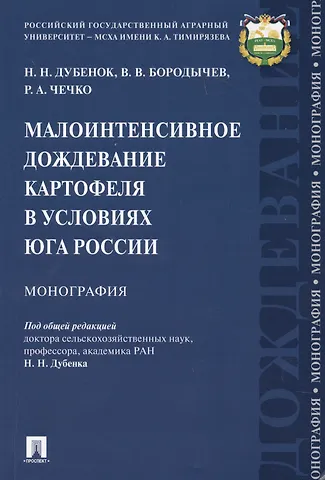В монографии представлены результаты исследований по малоинтенсивному дождеванию картофеля в Волгоградской области. Рассмотрены особенности формирования водного режима почвы, закономерности продукционного процесса картофеля. Дана комплексная оценка основных урожаеобразующих факторов и элементов малоинтенсивного дождевания картофеля в условиях юга России. Книга предназначена научным сотрудникам, преподавателям, аспирантам и студентам высших учебных заведений, руководителям и специалистам хозяйств различных форм собственности.