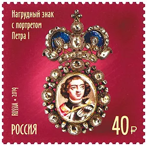 На почтовых марках изображен Нагрудный знак с портретом Петра I, относится к началу XVIII в., вручался по специальному высочайшему соизволению членам императорской фамилии и самым высшим и заслуженным сановникам государства за особые заслуги перед Отечеством, приравнивался к орденам.