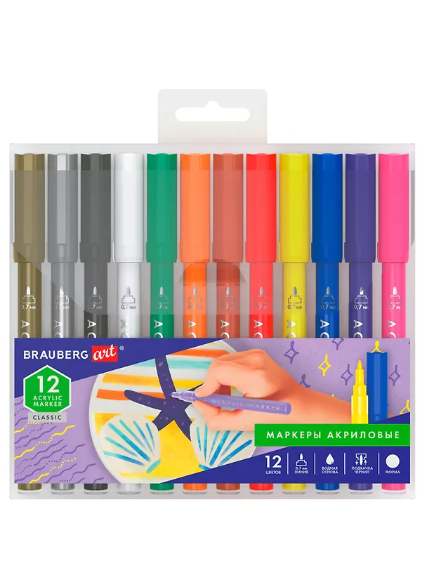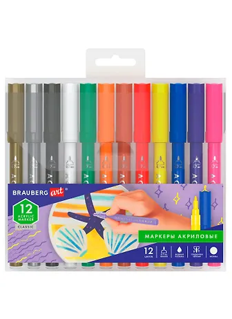 Маркеры акриловые 12цв для рисования и хобби, 0,7мм, BRAUBERG ART CLASSIC