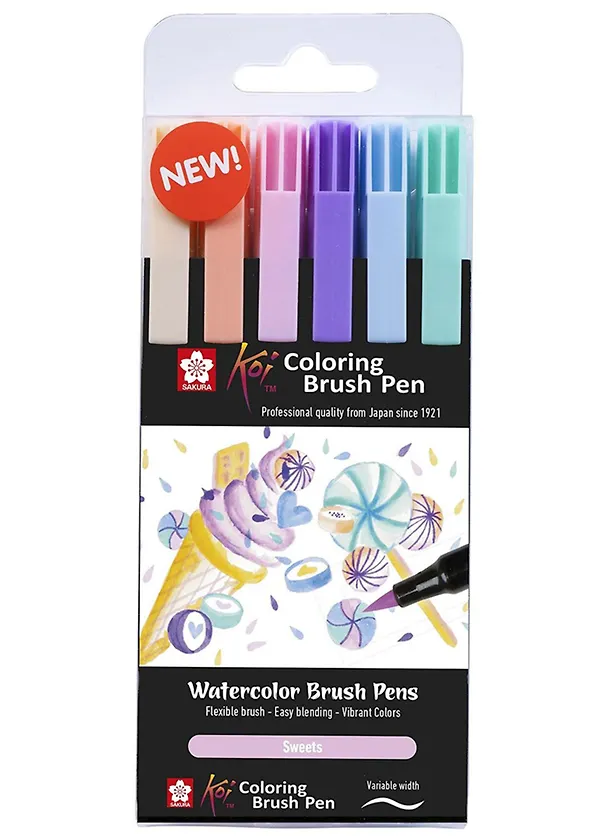 Набор маркеров акварельных Koi Сладости кисточка 6 цветов в блистере Цвета в наборе: 9, 205, 123, 238, 237, 426 Гибкий нейлоновый наконечник кисть позволяет менять толщину линии за счет силы нажимаю Маркеры не имеют запаха, чернила на основе красителей. Для иллюстраций, скетчей, технического рисунка, мультипликаторов, комиксов и других видов хобби и творчества."