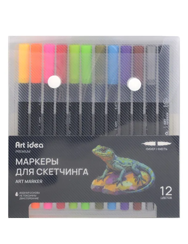 Маркеры для скетчинга Art idea на водной основе — удобный набор из 12 цветов для ярких и аккуратных иллюстраций. Каждый маркер двусторонний: мягкая кисть подходит для заливки и каллиграфии, линер — для чётких контуров и прорисовки деталей. Благодаря водной основе цвета легко наслаиваются, смешиваются и позволяют создавать плавные переходы.