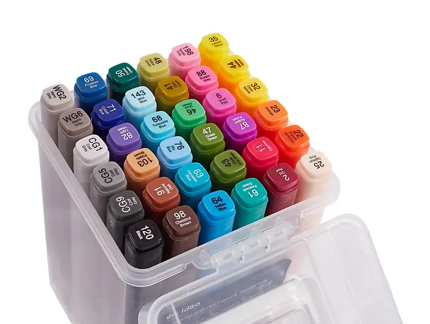 Маркеры для скетчинга Art idea на спиртовой основе — удобный набор из 36 насыщенных оттенков для скетчей, иллюстраций, манги и дизайна. Двусторонний формат с пулевидным и скошенным наконечниками позволяет прорисовывать тонкие детали и делать ровные заливки одним инструментом. Цветные колпачки помогают быстро находить нужный тон, а компактный пластиковый бокс обеспечивает аккуратное хранение и удобную переноску набора дома, в студию или на учёбу.