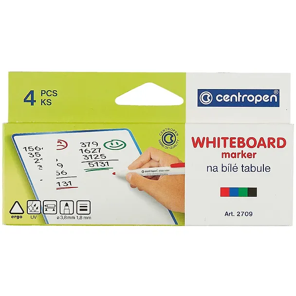 Набор маркеров CENTROPEN используется для письма на белых стираемых досках. Эргономичный корпус обеспечивает удобный захват маркера и комфортное письмо. Специальный состав чернил на спиртовой основе практически не имеет запаха, чернила быстро высыхают и обладают высокой светостойкостью. Надписи, сделанные маркером, удаляются сухим способом стирания. Совершенно безопасен для здоровья. Круглый наконечник позволяет провести линию толщиной 1,8 мм. В упаковке четыре цвета: красный, синий, зеленый, черный. Хранить в горизонтальном положении.