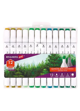 Маркеры для скетчинга 12цв двусторонние, цвета леса, BRAUBERG ART DEBUT "WHITE"