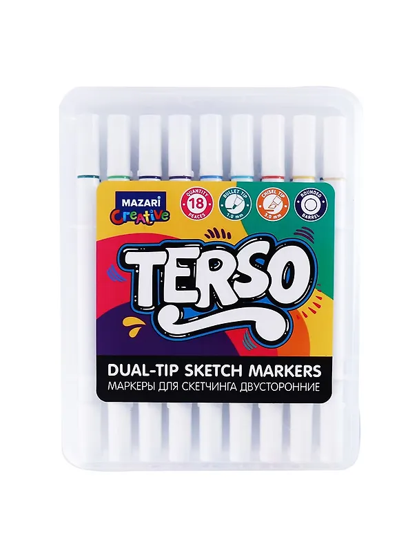 Маркеры для скетчинга 18цв "TERSO" двусторонние, пулевидный/клиновидный наконечники 1-3мм, пластиковая упаковка