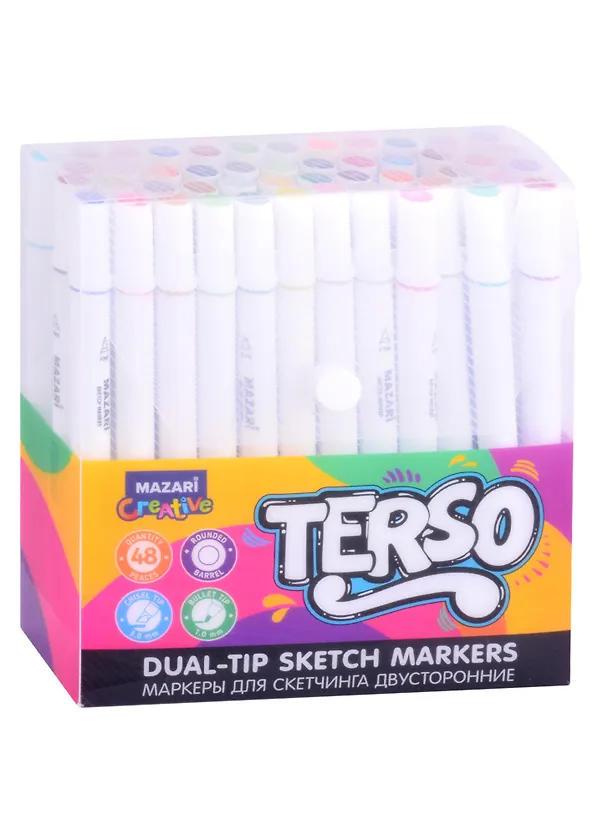 Маркеры для скетчинга TERSO двусторонние 48цв, пулевидный/клиновидный наконечники 1-3мм, тканевый футляр
