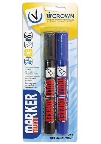Маркеры перманентные, 2 цвета (черный, синий), 5 мм, пластиковая упаковка, подвес, CROWN