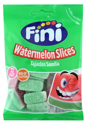 Мармелад жевевательный FINI Арбузные дольки, 90гр.: "сироп глюкозы, сахар, вода, желатин, увлажнитель: сорбит, кислоты: молочная кислота, лимонная кислота, желирующий агент: пектин, ароматизаторы идентичные натуральным, регулятор кислотности: лактат натрия, малат натрия, концентраты: сафлор, морковь, черная смородина, красители: синий блестящий FCF. Изготовлено на фабрике, где используются молочные производные.