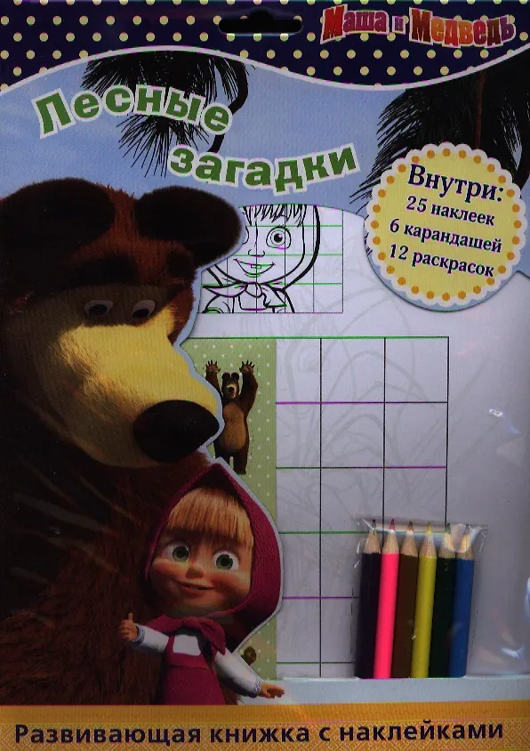 Лесные загадки. Маша и Медведь. Развивающая книжка с заданиями и наклейками. Внутри: 25 наклеек; 6 карандашей; 12 раскрасок.