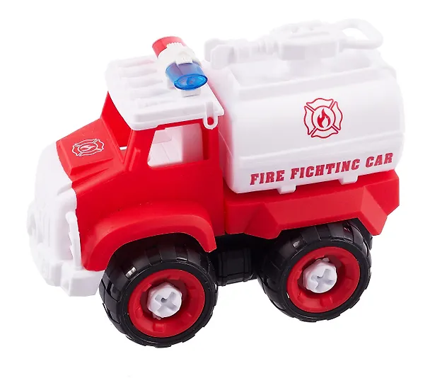 Будет здорово вместе с ребёнком разыграть сценку: у игрушек случился пожар, и машинка спешит на помощь. Объясните ребёнку, что такое брандспойт, как используется цистерна и для чего пожарные включают сирену. А после с помощью отвёртки помогите малышу снять колёса. Это хороший вариант обучения, развития мелкой моторики и усидчивости через игру.