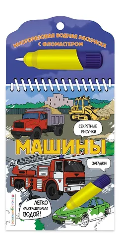 Каждый разворот – специализированные машины: служебные, сельскохозяйственные, строительные, городские. Фломастер наполняешь водой и раскрашиваешь. Потом эта страница снова становится белой. Есть вопросы на эрудицию и загадки.