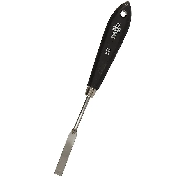 Узенький мастихин для прорисовки архитектуры в урбанистических пейзажах. Был куплен для рисования гуашевыми и масляными красками, также часто использую его для перекладывания разовой порции краски из баночки на палитру и для замеса оттенков. Мастихин мне понравился, несмотря на то, что его прямоугольная форма не особенно универсальна.